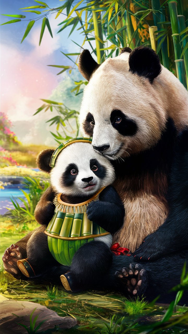 Little Panda with its Mother in Bamboo Garden